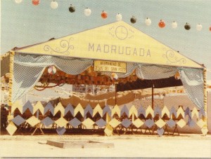 Imagen del año 1982 donde podemos observar la portada de la caseta, en la pañoleta que coronaba dicha portada podemos leer la denominación que se le dio durante años a la caseta (Madrugada) y el detalle del reloj marcando las tres de la mañana, hora en la que esta Hdad. Inicia su salida penitencial.