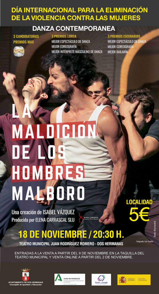 Eventos Teatro Danza contemporánea «La maldición de los hombres Malboro» por Administrador|Publicada 8 de noviembre de 2021Lugar: Teatro Municipal Juan Rodríguez RomeroPrecio: 5 eurosFecha: 18 de noviembre de 2021 a las 20:30 horas