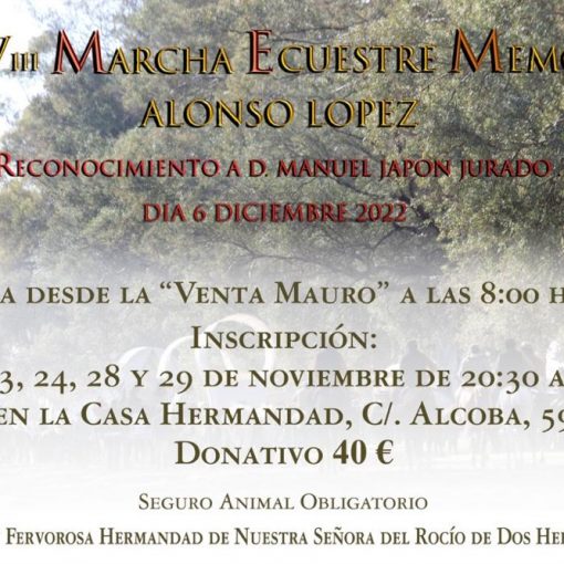 Publicada 17 de noviembre de 2022 VIII Marcha Ecuestre Memorial Alonso LópezEl próximo 6 de diciembre a las 8 horas tendrá lugar la VIII Marcha Ecuestre Memorial Alonso López. Inscripción en la casa […]