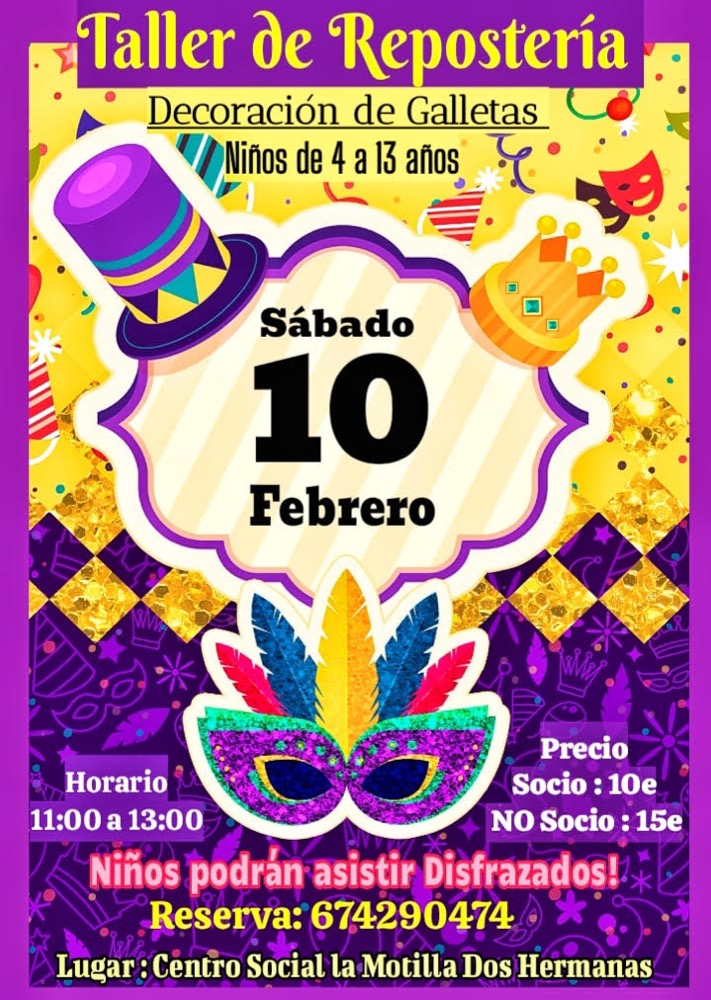Actividades Taller Repostería Infantil en el CS La Motilla por Administrador|Publicada 15 de enero de 2024El próximo sábado 10 de febrero de 11 a 13 horas se realizará un taller de repostería infantil con motivo del Carnaval.