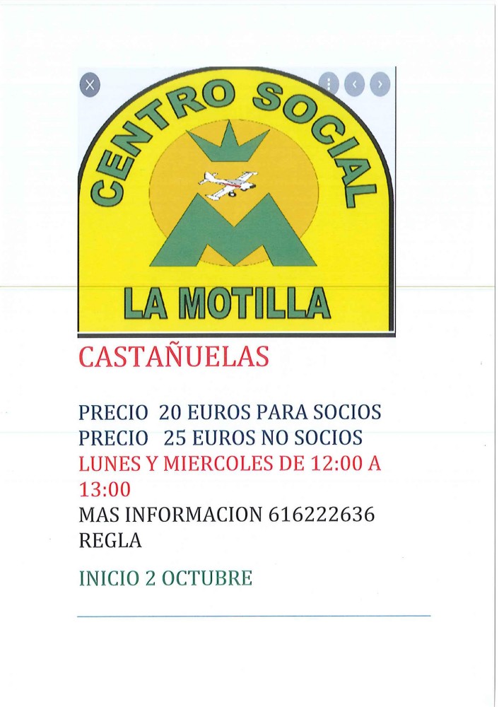Actividades Clases de castañuelas en el CS La Motilla por Administrador|Publicada 20 de septiembre de 2024A partir del 2 de octubre se inician clases de castañuelas, los lunes y miércoles de de 12 a 13 horas, en el CS La Motilla.