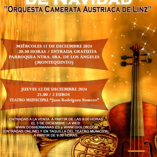 Lugar: Ntra. Sra. de Los Ángeles (11 de dicimenbre a las 20:30 horas) Teatro Municipal Juan Rodríguez Romero (12 de diciembre de 2024 a las 21 horas)Dirección: MontequintoPrecio: Entrada gratuitaOrganiza: Delegación de Cultura y Fiestas Concierto Extraordinario de Navidad de la Orquesta Camerata Austriaca de Linz.