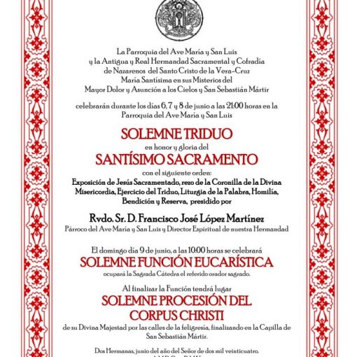 La Hermandad Sacramental de la Sagrada Cena tributará (D.m.) a su Amadísimo Titular, el Señor de la Sagrada Cena, Solemne Triduo durante los días 5, 6 y 7 de junio, comenzando a las 19:30 horas con el siguiente orden: Rezo del Santo Rosario a Ntra. Sra. del Amparo y Esperanza, […]