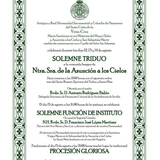Publicada 9 de julio de 2024 Cultos en honor de Nuestra Señora de la Asunción a los CielosEl próximo jueves 15 de agosto, en gloriosa procesión, saldrá el paso de Nuestra Señora de la Asunción. Información complementaria a los […]