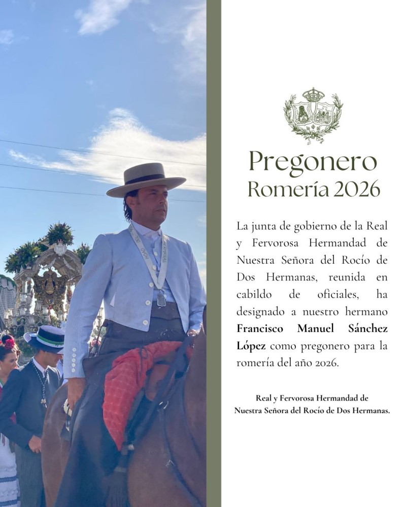 La Real y Fervorosa Hermandad de Nuestra Señora del Rocío ha anunciado una emocionante designación de cara a la próxima Romería de 2026. La junta de gobierno de la Hermandad, tras reunirse en cabildo de oficiales, ha resuelto nombrar a Francisco Manuel Sánchez López como el Pregonero que ensalzará a […]