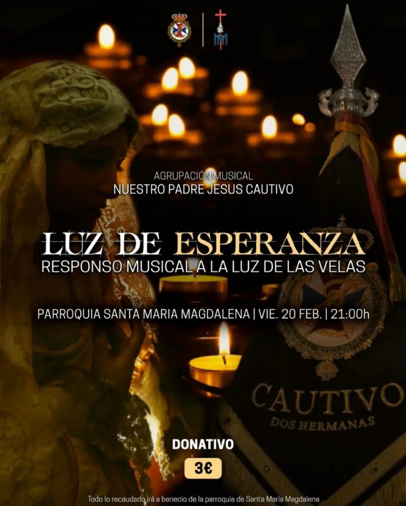 La Parroquia de Santa María Magdalena se prepara para vivir una de las noches más íntimas y sobrecogedoras de la Cuaresma. Bajo el título «Luz de Esperanza«, la Agrupación Musical Nuestro Padre Jesús Cautivo ofrecerá un responso musical único, creando una atmósfera de oración y recogimiento iluminada exclusivamente por la luz de las velas.
