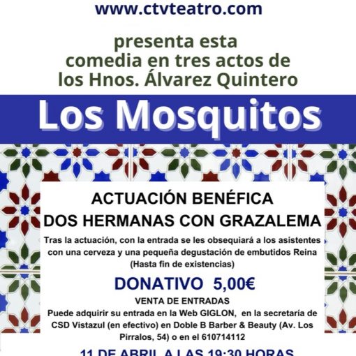 La cultura y la solidaridad se dan la mano una vez más. La prestigiosa compañía CTV Teatro presenta una de las obras más divertidas de los Hermanos Álvarez Quintero: la comedia en tres actos «Los Mosquitos». Se trata de una actuación benéfica bajo el lema «Con Grazalema», cuyo objetivo es […]