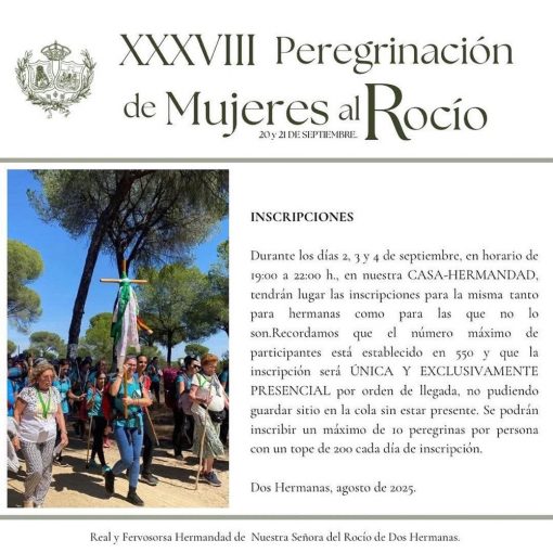 Un año más, la peregrinación de mujeres al Rocío de la Real y Fervorosa Hermandad de Nuestra Señora del Rocío es una de las citas más esperadas. Este año celebra su trigésimo octava edición, un evento que reúne a cientos de devotas en su camino hacia la aldea almonteña. Inscripciones […]